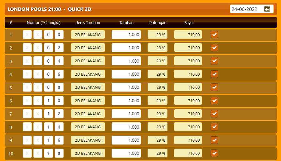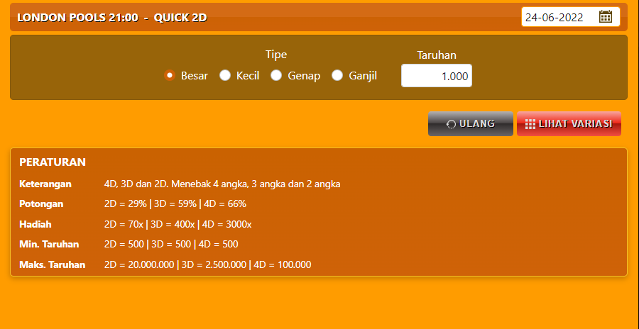 Memilih taruhan dengan tipe BESAR, masukkan jumlah taruhan pada kolom taruhan, kemudian klik tombol Lihat Variasi, otomatis pada layar menampilkan pasangan angka besar (50-99) dengan variasi pasangan 2D, seperti contoh di bawah ini.Memilih taruhan dengan tipe KECIL, masukkan jumlah taruhan pada kolom taruhan, kemudian klik tombol Lihat Variasi, otomatis pada layar menampilkan pasangan angka kecil (00-49) dengan variasi pasangan 2D, seperti contoh di bawah ini.