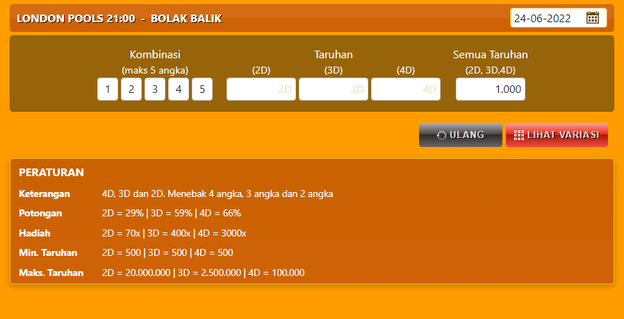 Jika bertaruh pada semua pasangan (2D, 3D, dan 4D) maka bisa masukkan jumlah taruhan pada kolom semua taruhan, dan klik tombol Lihat Variasi seperti contoh pada gambar dibawah ini.