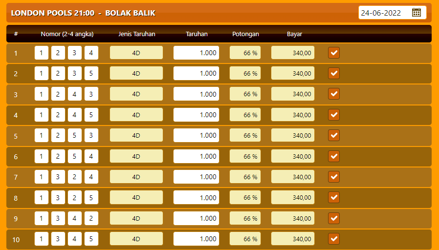 Taruhan 3 angka dan 2 angka otomatis terisi sesuai dengan kombinasi 4 angka yang dipilih.