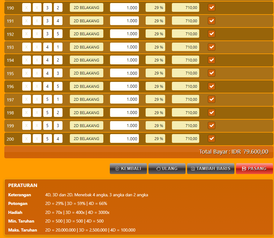 Pilih salah satu pasangan angka 2D, 3D, atau 4D. dan juga bisa memilih semua taruhan (2D, 3D, dan 4D).